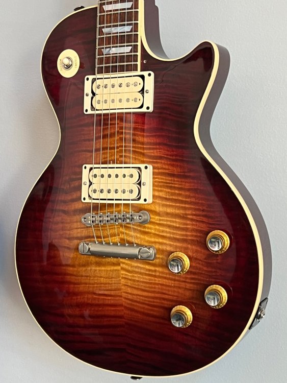 For the last several months, I've been having financial issues and had to sell off most of my name brand guitars. I ended up refinancing to ease the pain a bit. Living on less than $100 a month is not fun. And I have equity in the house, so I'm releasing the pressure and living off of it. It's not like I have heirs to pass anything to. The payout will happen this week, so things will be much easier after that. I just found this on Reverb at a price too good to pass up. It's a 2022. I've been getting away from flame maple, etc. While I appreciate the beauty, I'm far more interested in function right now. So I've been looking at black and oxblood and was torn between a Les Paul Standard and an H-150. The H-150 won. I'll bring it to PSP. And I'm not rebuilding the collection to what it was before. I'm fine with what I have. The guitar should arrive within the next week.7 points