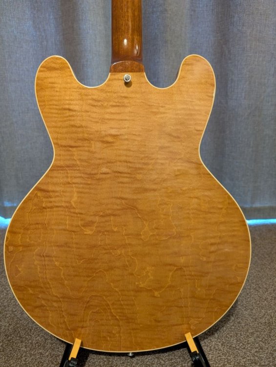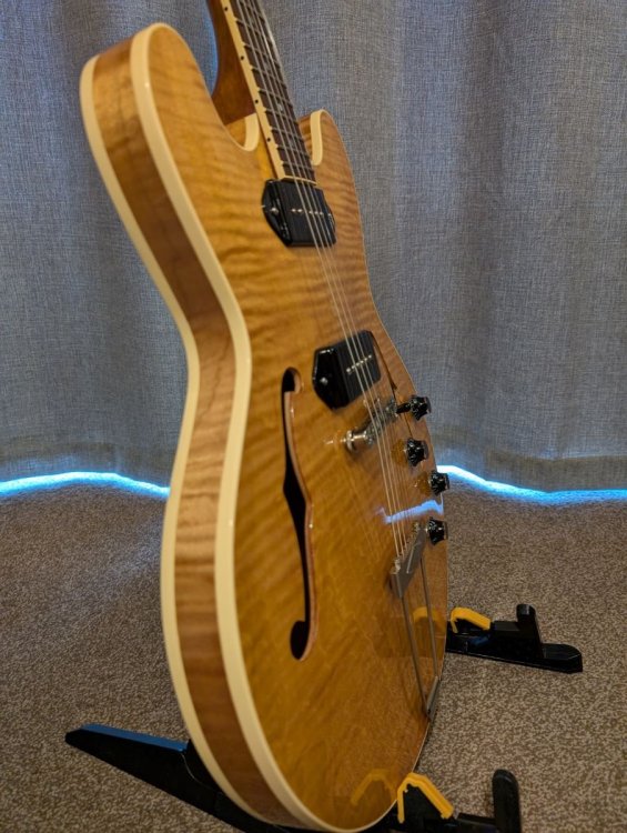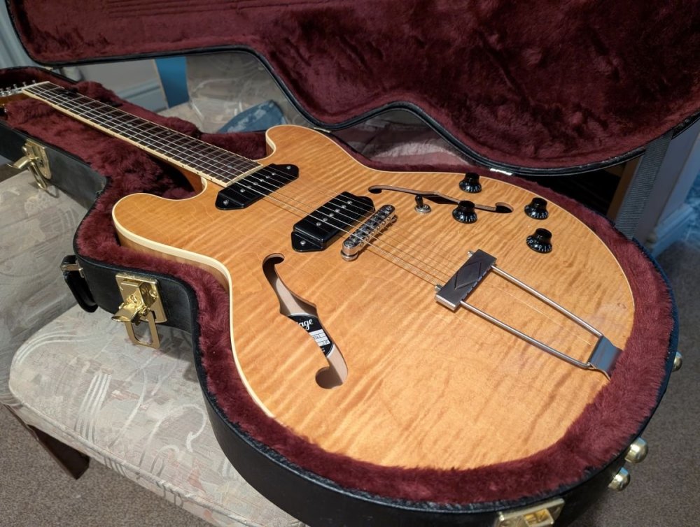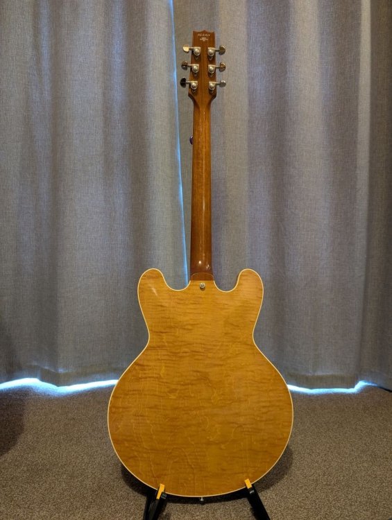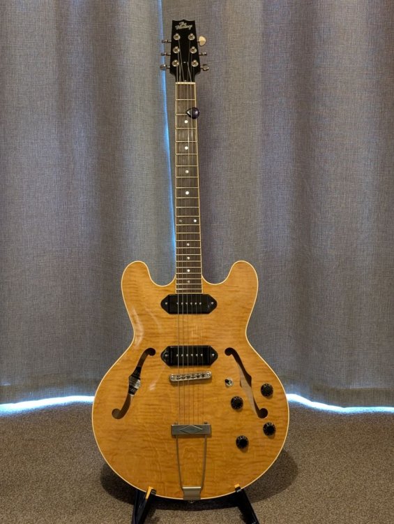 All this talk of H530s started me thinking that one would be quite nice, then I got a message from Cliff Brown of 633 amps. One of his customers had an H530 to sell and, knowing I was a fan of Heritage guitars, would I be interested? Er, yes... Cliff gave me his contact details, I got in touch and arranged to have a look at the guitar, which was located about 1.5 hours drive away. Suffice to say it's a 2018 model in Antique Natural, and playing it through a 633 Firefly (like the one I recently bought) was enough to convince me to buy it. It's light, 2.69kg or 5lb 15oz, and those Lollar P90s sound great! Some pics...5 points