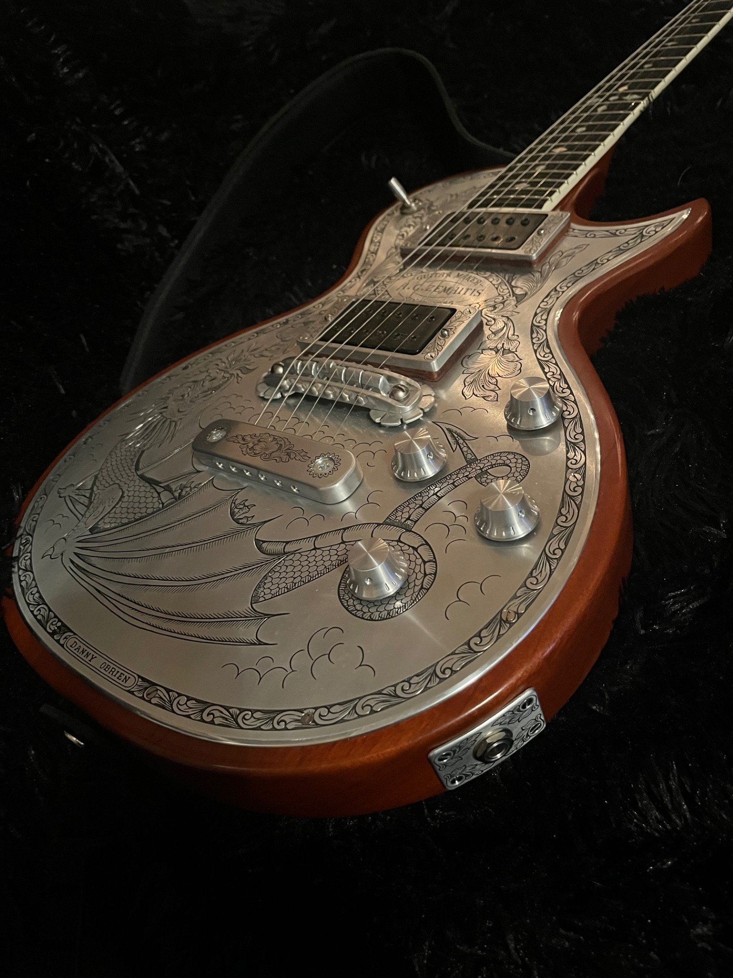 2. Honduran Mahogany, both neck and body are 3 piece, with reverse oriented grain in the middle piece for stiffness. That is what Tony Zemaitis always did in the originals, and only the first generation of Zemaitis reissues are built that way. The newer ones are one piece, and use African Mahogany. It's a nice wood but it doesn't sound the same. The top on this guitar is slightly carved too, the new ones aren't. Another thing these first generation guitars have unbelievablly good fretwork and the nicest ebony fingerboards that I've ever played on. The grain is ridiculously tight, and they are finished to perfection. They are smooth as a baby's as* so to say. I have 6 Zemaitis guitars, and I really like all of them, but this one, and the Dragon are first generation, and they both really stand out. As for Wolfetone pickups, I'm a fan. I have a Legend in the neck of one of my other custom shop Zemaitis guitars along with a Fenris in the bridge. And my Custom Shop SG Special has a mean and meaner P90 set. He really makes great sounding pickups! The only weak point on the first generation Zemaitis guitars were the pickups, they just used DiMarzio DP103s. They had to pick a pickup they thought would work for most people, but frankly they don't it for me. When Tony Zemaitis built the originals he would many times have the buyer of his guitars supply him with their favorite pickups. If the owner didn't specify what pickup they wanted, Tony would many times use Bill Armstrong pickups that were custom wound for him. His son Kent Armstrong still winds that exact pickup, the 12 pole, so I had him wind me a pair for the Dragon. The don't work with Zemaitis pickup rings so I had to make custom pickup risers for them. They sound GREAT!