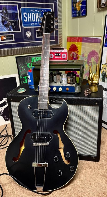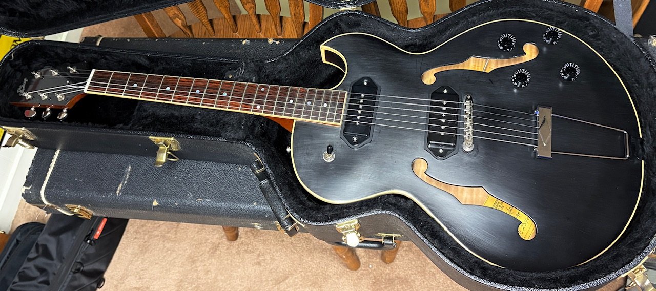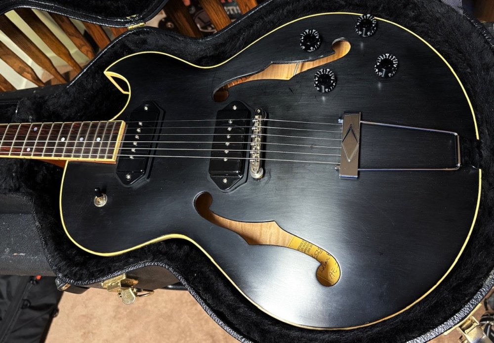 I found this on Reefeeverb. The Heritage H525 is a full hollow thin line guitar with a Florentine cutaway. Maple Laminate top and back with a solid maple rim. Mahogany neck with a rosewood fretboard. 2 Lollar dog ear P90s. The H525 is loosely based off of the vintage Gibson ES125. These H525s RARELY come up for sale. But this one was dramatically different. The body was finished in a matte black. Originally is was a VSB (vintage sunburst) kind of a light tangerine burst. The H525s had a cult following among Heritage enthusiasts. But not many were ever made. When I first saw it, I wasn’t a fan of the refin. But after stalking the ad for a couple of days, I decided to pull the trigger. I figured, worst case scenario, I could always get the top refinished at some point if I don’t like it. But it’s actually pretty cool. The seller also upgraded the bridge to a Faber ABR1. I believe everything else is stock. He currently has it setup for 11s. I will be putting 9s on it, so there will be some extensive setup work to be done. I had one of these 525s many years ago and they are such a joy to play. Lightweight and full of warm creamy goodness!!! This is a pic from the seller. I will have pics and a full report after setup.