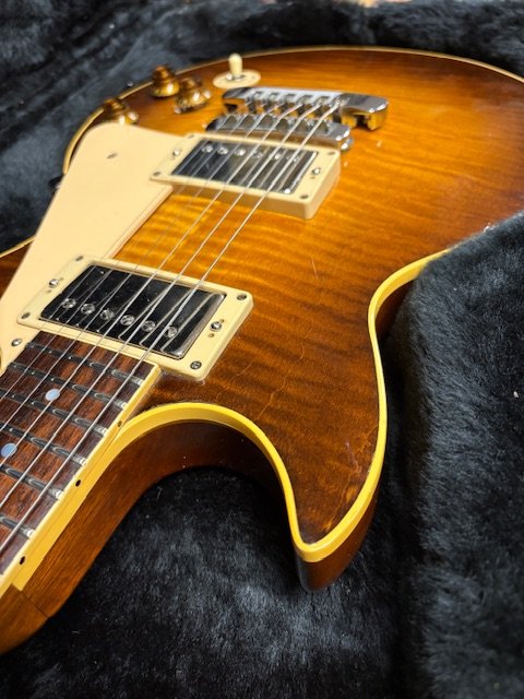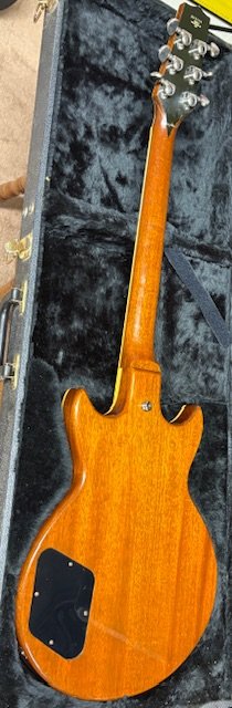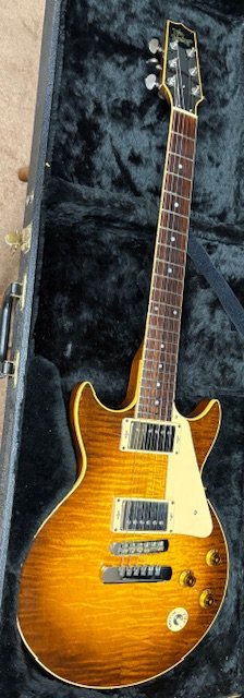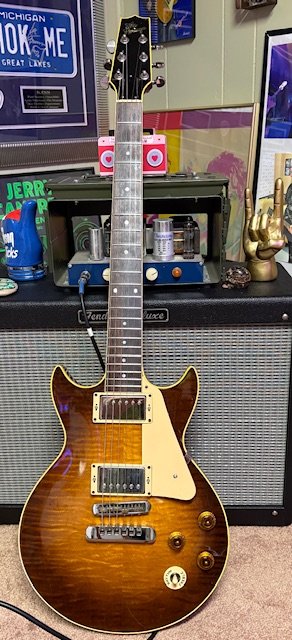 1987 HERITAGE H170… 1st generation H170 double cut. Honduran mahogany body and neck Bound and Carved flame maple top Bound Indian rosewood fretboard Bound and inlaid headstock This one has seen some action in its life. It suffered a headstock break/repair some years ago. It currently has a Lollar Imperial pickup in the bridge and a SD Seth Lover in the neck. Volume/Volume/Tone with a 3 way toggle. It’s a great playing and great sounding Heritage from their Golden Age!!!