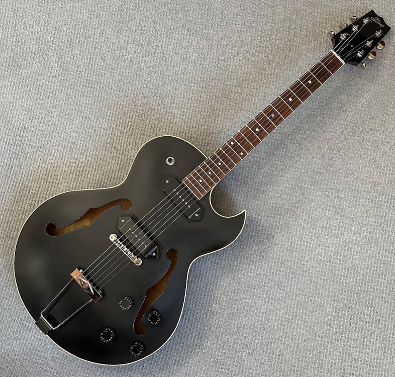 I found this on Reefeeverb. The Heritage H525 is a full hollow thin line guitar with a Florentine cutaway. Maple Laminate top and back with a solid maple rim. Mahogany neck with a rosewood fretboard. 2 Lollar dog ear P90s. The H525 is loosely based off of the vintage Gibson ES125. These H525s RARELY come up for sale. But this one was dramatically different. The body was finished in a matte black. Originally is was a VSB (vintage sunburst) kind of a light tangerine burst. The H525s had a cult following among Heritage enthusiasts. But not many were ever made. When I first saw it, I wasn’t a fan of the refin. But after stalking the ad for a couple of days, I decided to pull the trigger. I figured, worst case scenario, I could always get the top refinished at some point if I don’t like it. But it’s actually pretty cool. The seller also upgraded the bridge to a Faber ABR1. I believe everything else is stock. He currently has it setup for 11s. I will be putting 9s on it, so there will be some extensive setup work to be done. I had one of these 525s many years ago and they are such a joy to play. Lightweight and full of warm creamy goodness!!! This is a pic from the seller. I will have pics and a full report after setup.