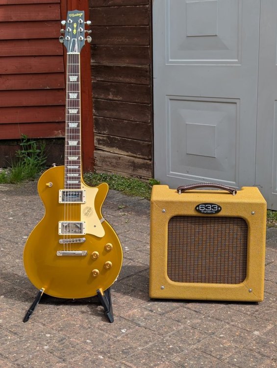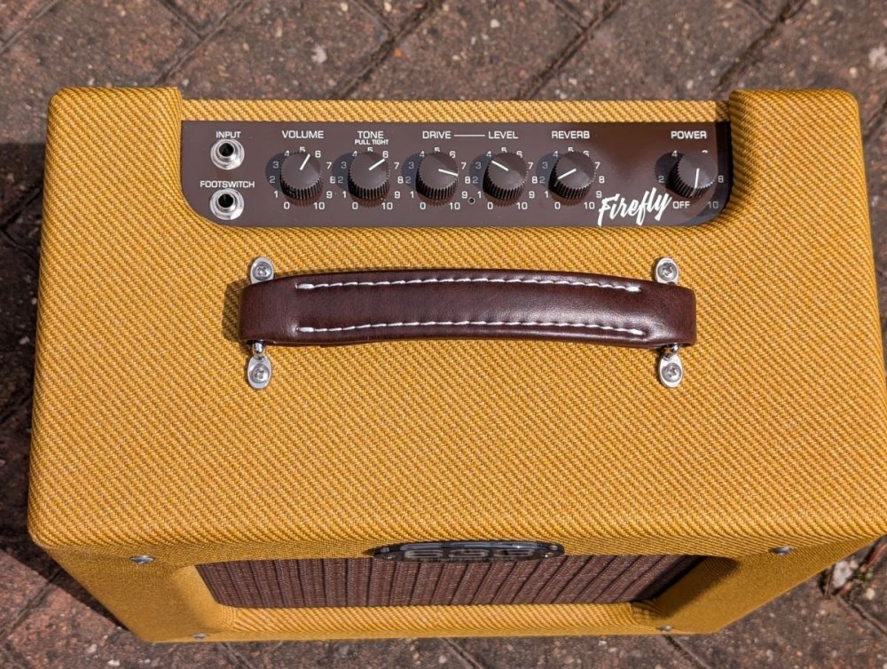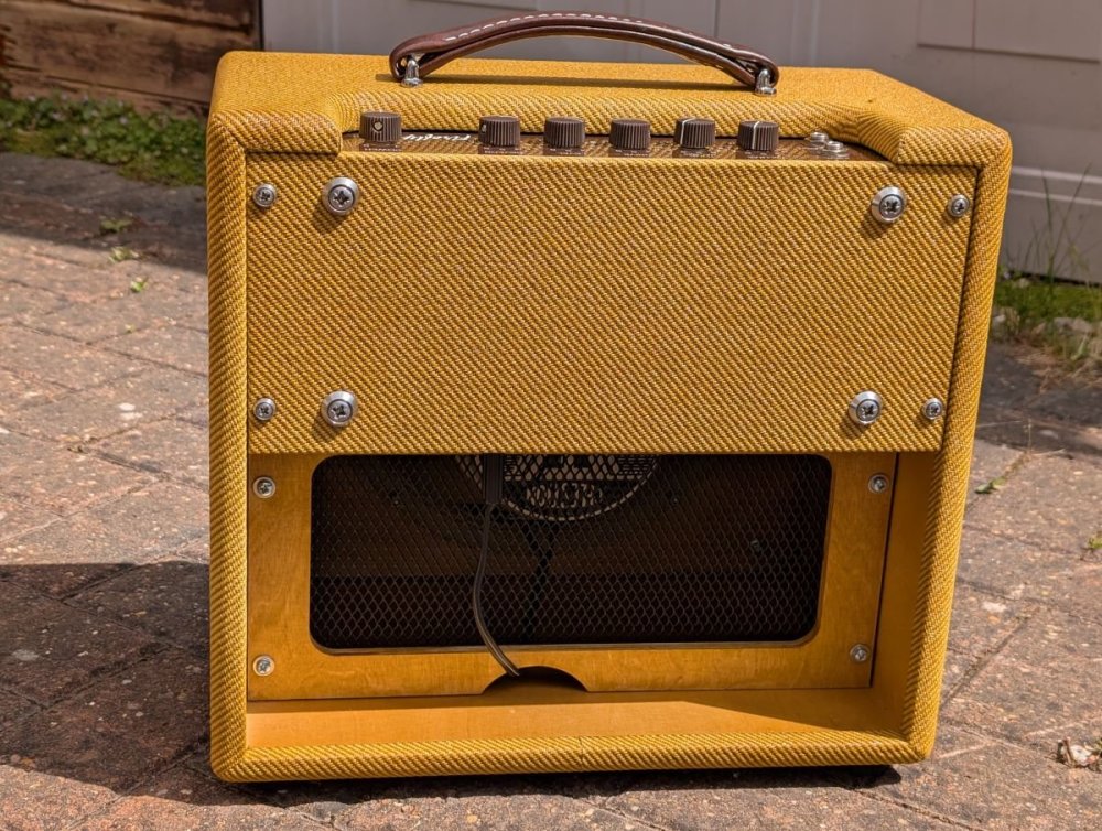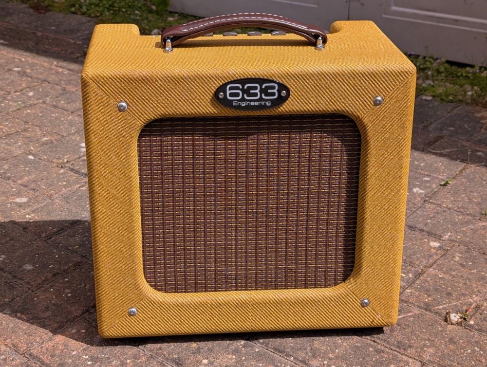 Birthday celebration part 2 (the CC H150 Goldtop was part 1). I've had the 633 Drive King for a few years now, and was intrigued when Cliff Brown at 633 brought out the Firefly, a 7 watt Class-A 1x10 combo. It's basically the Dragonfly with the overdrive circuit from the Drive King added. I ordered one in February and picked it up yesterday. It sounds very good... The controls are Volume, Tone (with a pull switch to toggle between "Tweed" and "Blackface"), Drive, Level, Reverb and Power. The Drive switch and Cab-sim output re located underneath at the back, while Drive can also be activated with a footswitch. The range of tones available is pretty wide by judicious use of the volume, drive and power controls, from a sparkling clean to Santana-like sustain, all at reasonable volume levels. Here's designer Cliff Brown putting the prototype through its paces... Some photos...