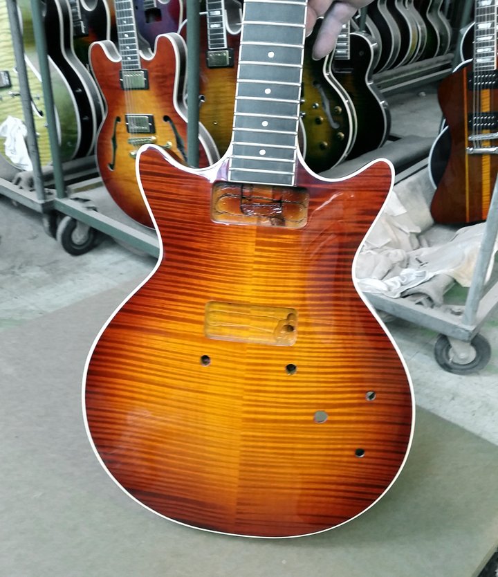 I'm not sure if this is unusual or business as usual. When Marv wanted to show me how the figuring would look when my guitar was finished, he spit on the flame maple top and rubbed his spit in. Flamed maple top looked Fab, ha.
