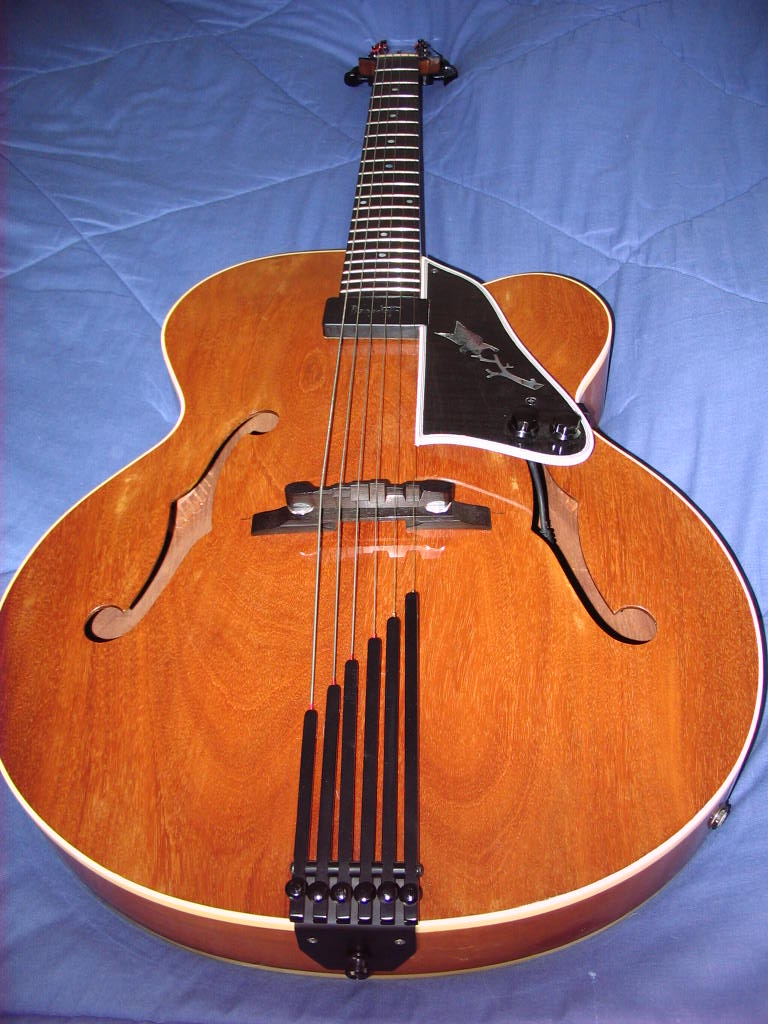 Genericmusic Posted February 26, 2012 Author Posted February 26, 2012 Very cool. Who is Tim Jones? That would be me. I couldn't very well put jazz hack. Well... I could but that would surely deflate my ego. That's one gorgeous looking guitar. The bridge appears similar to those stock on Guild archtops, almost identical to the bridge on my X-500. How's the Benedetto? I am sold on Benedetto's and have been for quite some time. IMHO they are the best. In another thread they were talking about achieving clear acoustic sounds from an archtop . I can do that with this PUP. I really don't what's stock on it anymore. I gave up trying to figure it out. Ren old me that they were using Benedetto PUPs about the time the guitar was being build in '98 but it came with a Benedetto PG. I didn't like it, just a heavy old chunk of plastic. I put the Eagle inlay one on about 7 months ago. I have the matching mahogany PG with the cream binding too but put that up in the for sale thread. If it doesn't sell I'll keep it and put another PUP on it. It also has and ebony finger board which I really like. Pete Moreno told me that it is the only Mahogany Eagle he's seen with the Eagle inlay head stock. He also said that the hardware was what is mostly found on the Johnny Smith model but I've seen at least one other model with the same hardware. I found it in a mom & pop music store several years ago all beat up. I knew it was meant for me the second I played it and the owner was glad to get rid of it. It is one of three "to the grave" guitars I own.