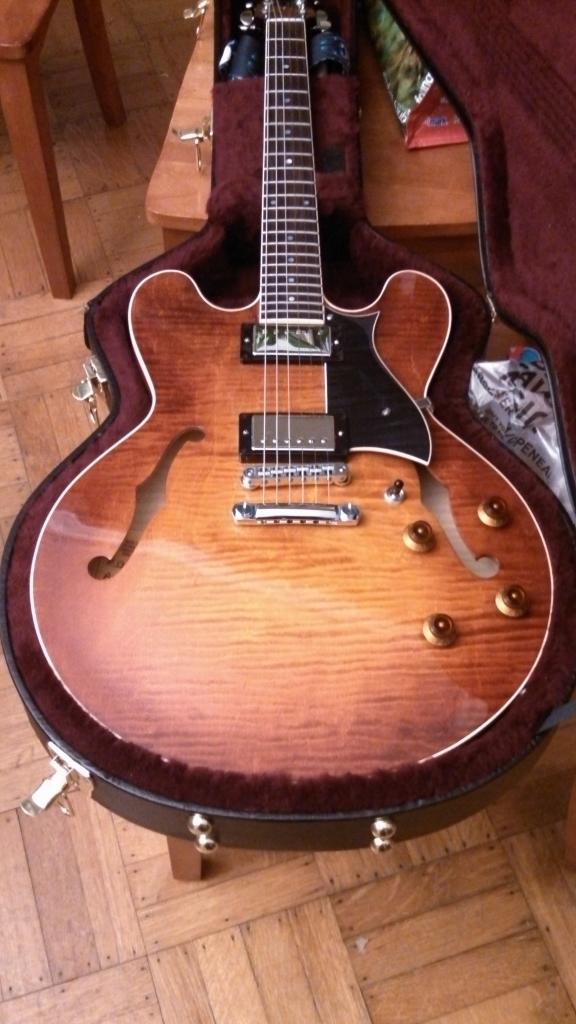 Eyegore Posted January 6, 2013 Author Posted January 6, 2013 Probably the nicest sounding guitar that I own. (I am mostly a Les Paul guy, but have been gassing for a 335 style guitar for some time) Its got Seth Lover pups, my first experience with them, they are great. The action was pretty high when I got it, but now that I have adjusted it so it is just above the buzzing level, it is sooo nice. The neck is great, I think that I will call it a '55 neck. Fatter than a 335 60's neck, but not quite a 50's neck. Just right. I figured that I had to add pictures, or it didn't happen.