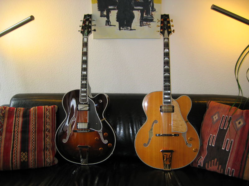 SofaPlayer Posted July 7, 2013 Posted July 7, 2013 I've picked up some company for my OSB Golden Eagle, an 11 year older sister in AN finish from 1999. A few dings, cracked binding and markings around the strap lock button show it's a player guitar but overall it is in good condition. No cracks in the wood, no repairs. What I really wanted is a P90 GE but they just don't exist on the used market so this one with a Duncan Phat Cat seemed a good choice. Acoustically it is much louder than the other GE, maybe because it has been played a lot all those years or also because of only one pickup dampening the top. The neck is slightly thinner, as has been said in other threads that the necks have become beefier lately. It still plays fine, although I prefer the neck of the other one. Plugged in its tone doesn't really differ much from the other GE with HRWs, the single coil just makes it a little brighter. Maybe I will swap the Phat Cat for a Lollar CC or Vintage Vibe HCC one day. And the next strings will be roundwounds, to compliment the great acoustic sound of the guitar and to increase the difference of both guitars. It's a lovely pair, I think. Two questions: Could the Phat Cat be the original pickup? There is no information about the pickup on the label. Has anybody seen this guitar before and knows something about its story? You never know, a previous owner might lurk around here.