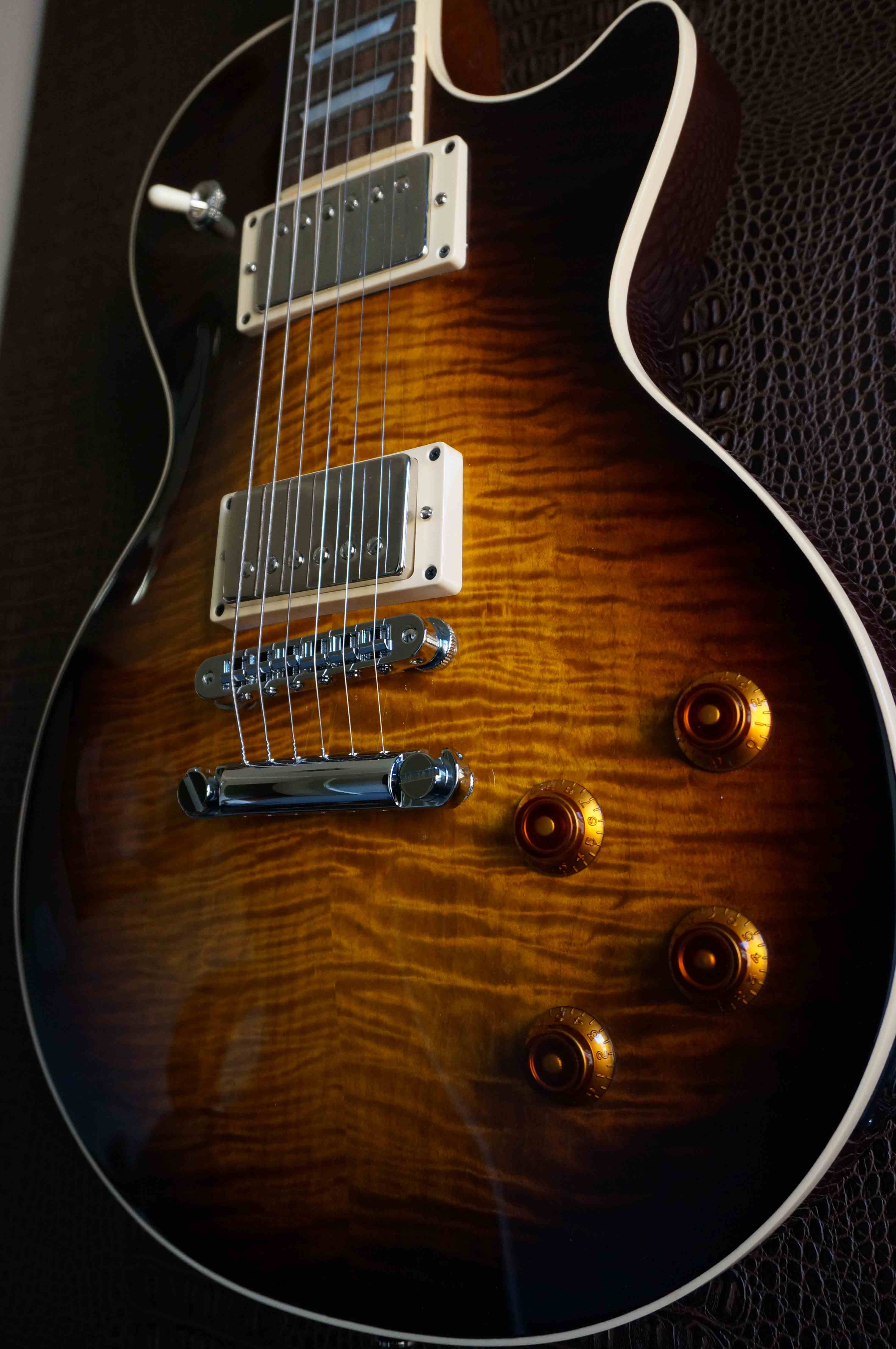 pressure Posted March 2, 2018 Posted March 2, 2018 Custom, we got custom. Started in 2014 and finished in 2015. Too much to list as custom hereabout I'll try. Gold GraphTech bridge, Gold Sperzel tuners, Gold Doyle Coils Humbucking pickups, Quilted Bigleaf Maple back with a Mahogny center strip, Sitka Spruce top, Spruce center block, 5-piece neck, Ebony fingerboard with 4mm pearl dot markers, bone nut, Transparent stinger (Ghost Stinger), RS Guitarworks electronics, 550 style bound Ebony pick guard, and Eagle and The Heritage pearl inlaid Ebony headstock. But the most customest thing about this Prospect is that the body is perfectly flat, not arched.