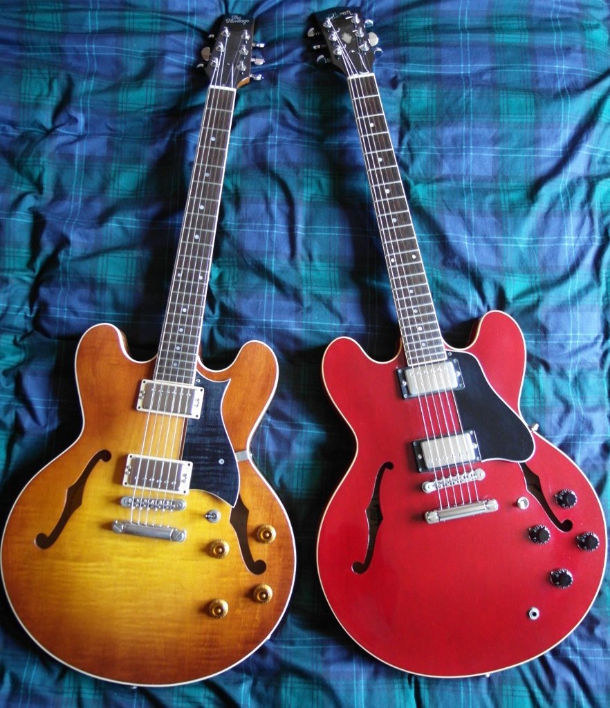 bobmeyrick Posted November 11, 2019 Posted November 11, 2019 I'm not sure the 535 is based on any particular 335, apart from the general principles involved in a semi-hollow guitar. The main difference I noticed is that the neck of the 535 is set back a little further into the body. The depth of the cutaway reached the 21st fret on the 535 and the 22nd fret on the 335. The controls are also positioned slightly differently - the pickup selector switch is a bit further forward, below the bridge, as opposed to below the tailpiece on the 335. The body is also a little bit thinner. Here's a photo to illustrate the subtle differences, my 2007 H535 and 1989 ES335 Dot ...