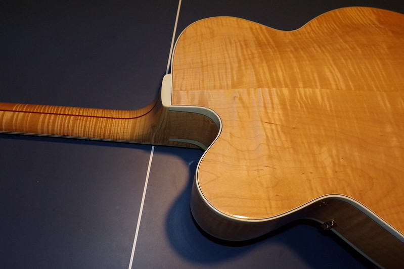 MartyGrass Posted April 16, 2021 Author Posted April 16, 2021 A blonde and a burst went to Pete Moreno today to buff. One may need another layer of clear coat on the top but he thinks buffing with suffice. I cleaned the other blonde up tonight. I have plenty of pics. The bracing looks good. The wood has good figuring. There is some bear claw and a lot of silking in the spruce. The 20th fret on the high E area needs either a little filing or a gentle tap. This one was ready to have the hardware put back on. I don't think it needs buffing. I chose some heavier strings to drive the top better since it is an acoustic. I used D'Addario Half Rounds 13-56s. I run the wrapped strings through fine steel wool a few times to smooth them out a little. The guitar is loud unplugged and has a good bottom end. It won't compete with a J200 but it doesn't want to anyway. The pickup is the Heritage Floating #3. That sounds just right. All's well. Pete Moreno turns 80 tomorrow. He's taking the day off he said.